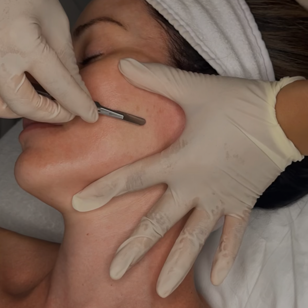 Epiblading is a cosmetic technique that involves using a sterile surgical scalpel to gently exfoliate the outer layer of the skin, removing dead skin cells and fine vellus hair "peach fuzz" resulting in a smoother, fresher and brighter looking complexion.